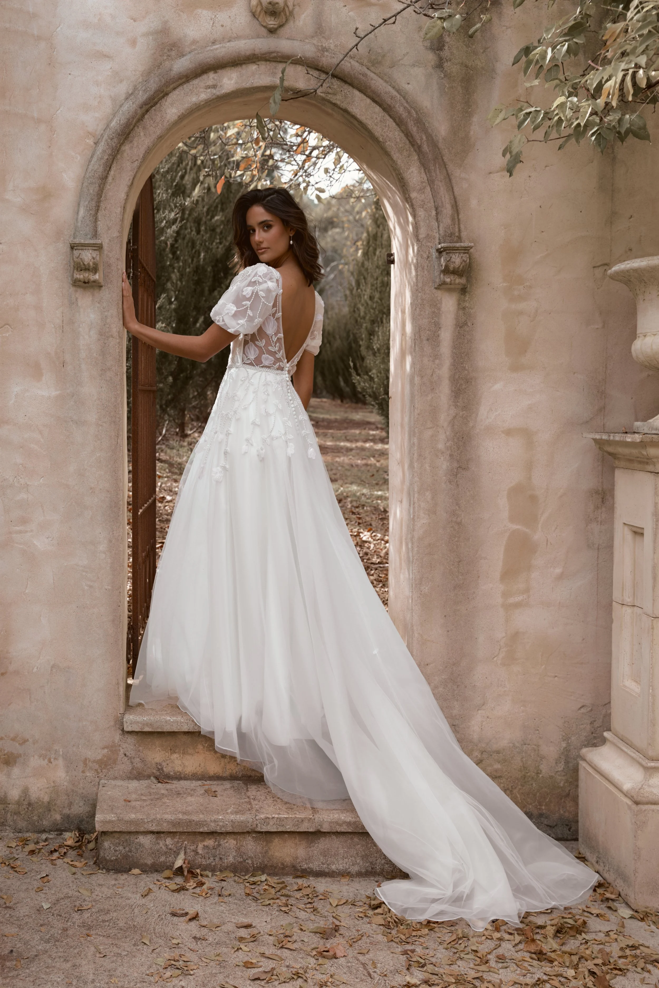 Crafted from layers of soft tulle and organza, the Iris gown features hand-embellished ivory floral appliqués that trail from bodice to skirt like a falling vine. Light, romantic, and effortlessly graceful—Iris is a timeless statement in modern femininity.